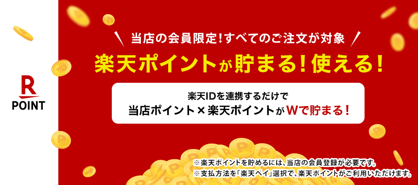 - 当店で楽天IDを連携すると、お買い物200円(税込)につき1ポイントの楽天ポイントが貯まります!