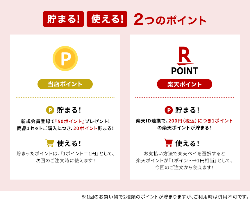 楽天ペイについては、お支払い方法ページをご確認ください。 - ポイント利用時は、楽天ポイントと当店ポイントの併用はできません。